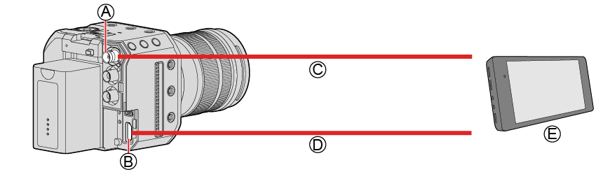 1Collegare la fotocamera a un monitor esterno o a un registratore esterno con un cavo HDMI o un cavo BNC.