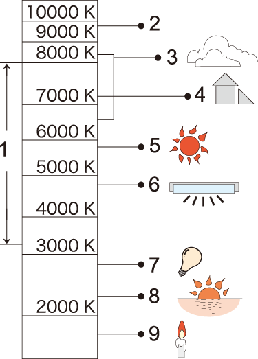 1سيعمل [AWB] ضمن هذا النطاق. 2سماء زرقاء 3سماء مليئة بالسحب (مطر) 4ظل 5ضوء الشمس 6ضوء فلوريسنت أبيض 7مصباح إضاءة متوهج 8شروق الشمس وغروبها 9ضوء شمعة |