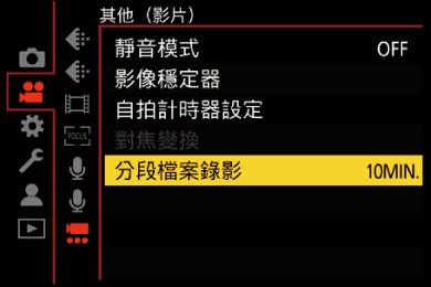 為避免影片因電源意外中斷而遺失,拍攝時會依設定的間隔將錄製的影片分段。