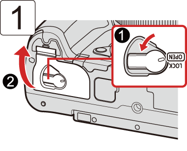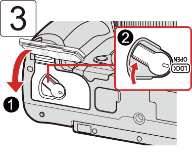 確定記憶卡存取指示燈為熄滅,然後打開電池蓋。(