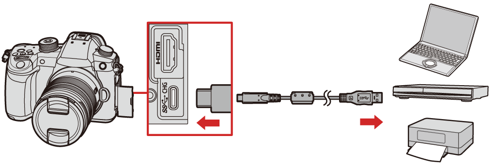 使用USB連接電纜將相機連接至PC、錄影機或印表機。