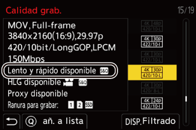 Los elementos disponibles para la grabación con vídeo Lento y Rápido se indican como [Lento y rápido disponible].