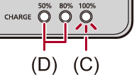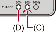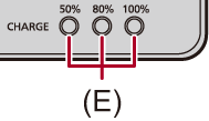 bullet02Kun akku on laitettu ja laturia ei ole liitetty virtalähteeseen, latausvalot kytkeytyvät päälle tietyksi ajaksi, jotta voit tarkistaa akun varaustason.