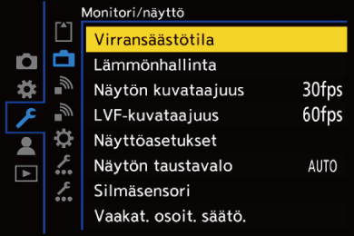 Toiminto kytkee automaattisesti kameran lepotilaan (virransäästö) tai etsimen/monitorinäytön pois päältä, jos ei suoriteta mitään toimenpiteitä asetetun ajan kuluessa. Vähentää akun kulumista.