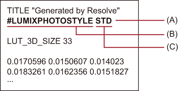 自作したLUTファイル(「.cube」形式のみ)には、ベースフォトスタイルの情報を付与できます。LUTファイルをテキストエディターで開き、タイトル行の下にフォトスタイル情報を挿入してください。