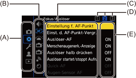 Menüelemente, die nicht eingestellt werden können, werden ausgegraut angezeigt.