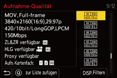 Wenn [Aufnahme-Dateiformat] auf [MOV] oder [Apple ProRes] eingestellt ist, können Sie Einstellungen wie Bildrate, Pixelzahl (Auflösung) und Kompressionsformat (YUV, Bitanzahl, Bildkompression) angeben und nur die Aufnahmequalitäten anzeigen, die diesen Bedingungen entsprechen.