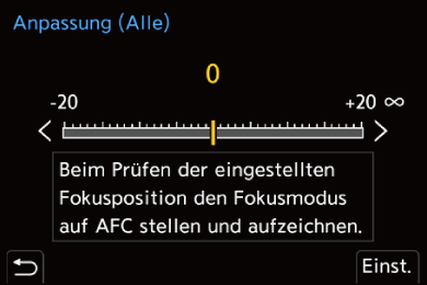 Der Fokuspunkt wird rückwärts bewegt, wenn er mit der [+]-Seite adjustiert wird. Der Fokuspunkt wird vorwärts bewegt, wenn er mit der [−]-Seite adjustiert wird.