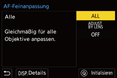 Wählen Sie [ALL] oder [ADJUST BY LENS] und drücken dann auf [DISP.].