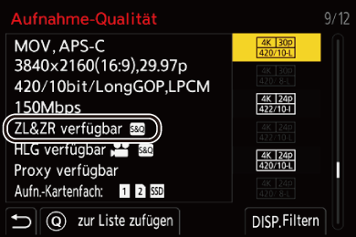 Optionen, die für Zeitlupen- und Zeitraffer-Videoaufnahmen verfügbar sind, sind mit [ZL&ZR verfügbar] gekennzeichnet.