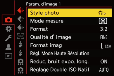 – [Cinelike A2]/[Cinelike D2]/[Cinelike V2]/[709Like]/[V-Log]/[LUT TEMPS RÉEL] (le Style Photo de base est [V-Log])/[2100Like(HLG)]/[Gamme totale 2100Like(HLG)] La plage de sensibilités ISO disponibles est également différente pour [LOW] et [HIGH] dans [Réglage Double ISO Natif]. Restaurez l’exposition si nécessaire lorsque la sensibilité ISO change.