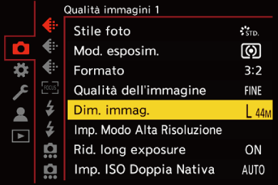 Imposta la dimensione dell'immagine della foto. La dimensione dell'immagine varia a seconda del [Formato] o dell'obiettivo utilizzato.