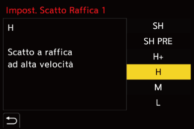 L’impostazione di [Tempo pre-reg. sc. raff. SH] si applica sia a [Impost. Scatto Raffica 1] sia a [Impost. Scatto Raffica 2].