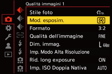 button_menu-set character_arrow [icon_picture]/[icon_movie] character_arrow [icon_photo-quality] character_arrow Selezionare [Mod. esposim.]