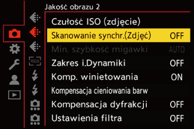 Szybkość migawki ustawiona dla funkcji skanowania synchr. jest zapisywana niezależnie od szybkości migawki używanej do normalnego rejestrowania. Na ekranie ustawień skanowanie synchr. można wywoływać i regulować aktualną szybkość migawki dla normalnego nagrywania.