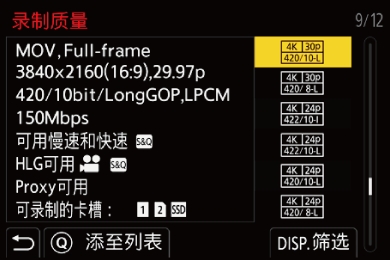 当[录制文件格式]设置为[MOV]或[Apple ProRes]时,可以指定帧速率、像素数(分辨率)和压缩格式(YUV、位值、图像压缩)并只显示满足这些条件的录制质量。