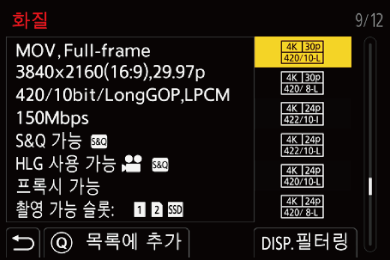 [녹화 파일 형식]을 [MOV] 또는 [Apple ProRes]로 설정하면 프레임 레이트, 화소 수(해상도), 압축 형식(YUV, 비트 값, 이미지 압축)과 같은 항목을 지정하여 해당 조건을 충족하는 촬영 화질만 표시할 수 있습니다.