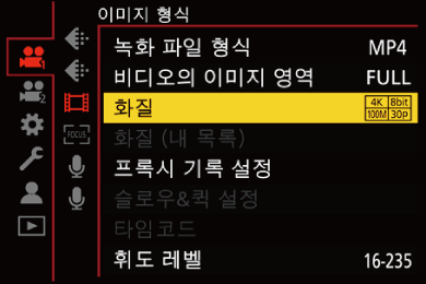 설정: [프레임 레이트]/[해상도]/[코덱]/[하이브리드 로그 감마]/[프록시 기록]