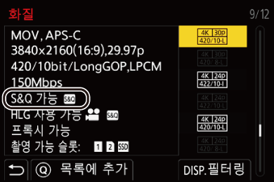 슬로우 & 퀵 비디오 촬영에 사용할 수 있는 항목이 [S&Q 가능]으로 표시됩니다.