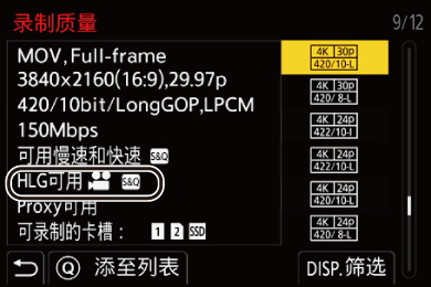 以HLG视频录制的可用的项目以[HLG可用]表示。