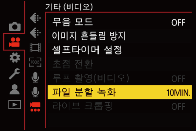 예기치 않은 전원 공급 중단으로 인한 비디오 손실을 방지하기 위해 비디오를 촬영하는 동안 촬영된 비디오가 설정된 간격으로 분할됩니다.
