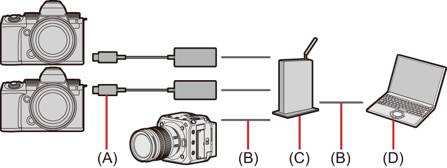 By using a commercially available USB ethernet adaptor, you can use tethered recording by connecting the camera to the PC via a LAN cable. Multiple cameras can also be operated remotely this way.