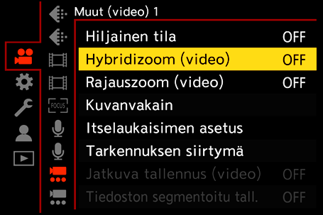 [Rajauszoom (valokuva)], [Hybridizoom (valokuva)], [Rajauszoom (video)] ja [Hybridizoom (video)] on lisätty.