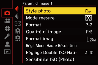 – [Cinelike D2]/[Cinelike V2]/[709Like]/[V-Log]/[LUT TEMPS RÉEL](le Style Photo de base est [V-Log])/[2100Like(HLG)]/[Gamme totale 2100Like(HLG)] La plage de sensibilités ISO disponibles est également différente pour [LOW] et [HIGH] dans [Réglage Double ISO Natif]. Restaurez l’exposition si nécessaire lorsque la sensibilité ISO change.