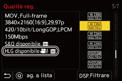 Le voci disponibili per la registrazione con video HLG sono indicate come [HLG disponibile].