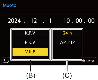 Näytä näyttöjärjestyksen (B) aikanäytön muodon (C) asetusnäyttö valitsemalla [Muoto] painamalla