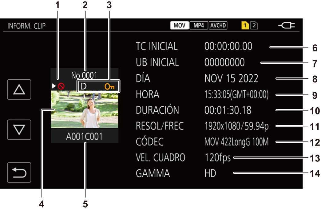 Muestra el formato del archivo de grabación y el códec de grabación del clip.